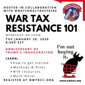 To commemorate the first anniversary of Trump’s inauguration, we will host a War Tax Resistance 101 on Zoom on Tuesday January 20th at 8p Eastern / 5p Pacific. Choose Democracy’s National Tax Strike will also be joining us for this session. Interest in war tax resistance continues to increase in the wake of ICE violence, attacks on Venezuela, threats to Greenland, and the list goes on…